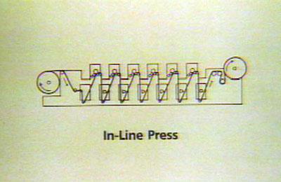 | Di-line pressescontain beberapa unit cetak yang dirangkai secara horisontal baris, masing-masing berdiri di lantai. Menekan di-line yang digunakan untuk mencetak label tekanan sensitif, papan bergelombang, dan Surat Kabar. Salah satu keuntungan dari pers di-line adalah bahwa operasi-operasi tambahan seperti diecutting dapat dilakukan antara warna stasiun di pers. | ![]() |