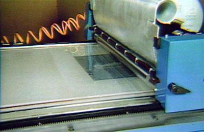 | Setelah paste-up selesai dan terpisah negatif ditembak dasar seni dan Overlay (atau film Keluaran menggunakan untuk pembuatan), negatif yang digunakan untuk membuat karet atau photopolymer flexographic piring. Ada tiga langkah dasar dalam karet platemaking. Pertama ukiran dari negatif dibuat dengan menempatkan negatif atas lembaran logam cahaya-darinya dan menawarkannya kepada intens cahaya dalam bingkai vakum. | ![]() |