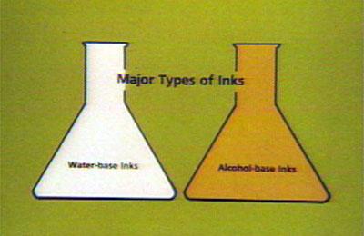 | Dua jenis utama dari cairan tinta yang digunakan pada flexography arewater-baseandalcohol-base. Dasar alkohol tinta yang paling sering digunakan untuk mencetak pada substrat nonabsorbent seperti film dan foil. Tinta air-base paling sering digunakan pada substrat penyerap seperti kertas dan kertas karton. Meskipun, dengan perubahan teknologi, tinta air-base juga digunakan pada substrat nonabsorbent. | ![]() |