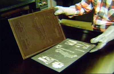 | Langkah kedua adalah membuat cetakan dari ukiran dengan menekan logam ukiran terhadap material matriks berpemanas yang mengeras di tekan molding. Molding tekanan yang dihasilkan oleh tenaga hidrolis ke bawah meja, atau platen, seperti terlihat di sini, platen atas tetap stasioner. | ![]() |