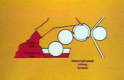 | Flexography menggunakan tinta cairan yang tipis. Tidak seperti lambat-pengeringan tinta pasta letterpress dan lithography, tinta cairan dari flexography kering dengan cepat. Satu keuntungan menggunakan tinta cairan adalah bahwa mereka memerlukan sistem inking pendek dan belum digenapi. Lebih sedikit rol diperlukan meteran jumlah tinta dari tinta panci ke piring daripada ketika menggunakan pasta tinta. | ![]() |