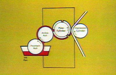 | Bahan akan dicetak, orsubstrate,Tiket antara silinder plate dan silinder kesan logam dipoles. Silinder kesan punggung dan mendukung substrat seperti itu kontak plat cetakan. Gap, atau nip, antara dua silinder ini harus tepat untuk memberikan tekanan pencetakan yang tepat. | ![]() |